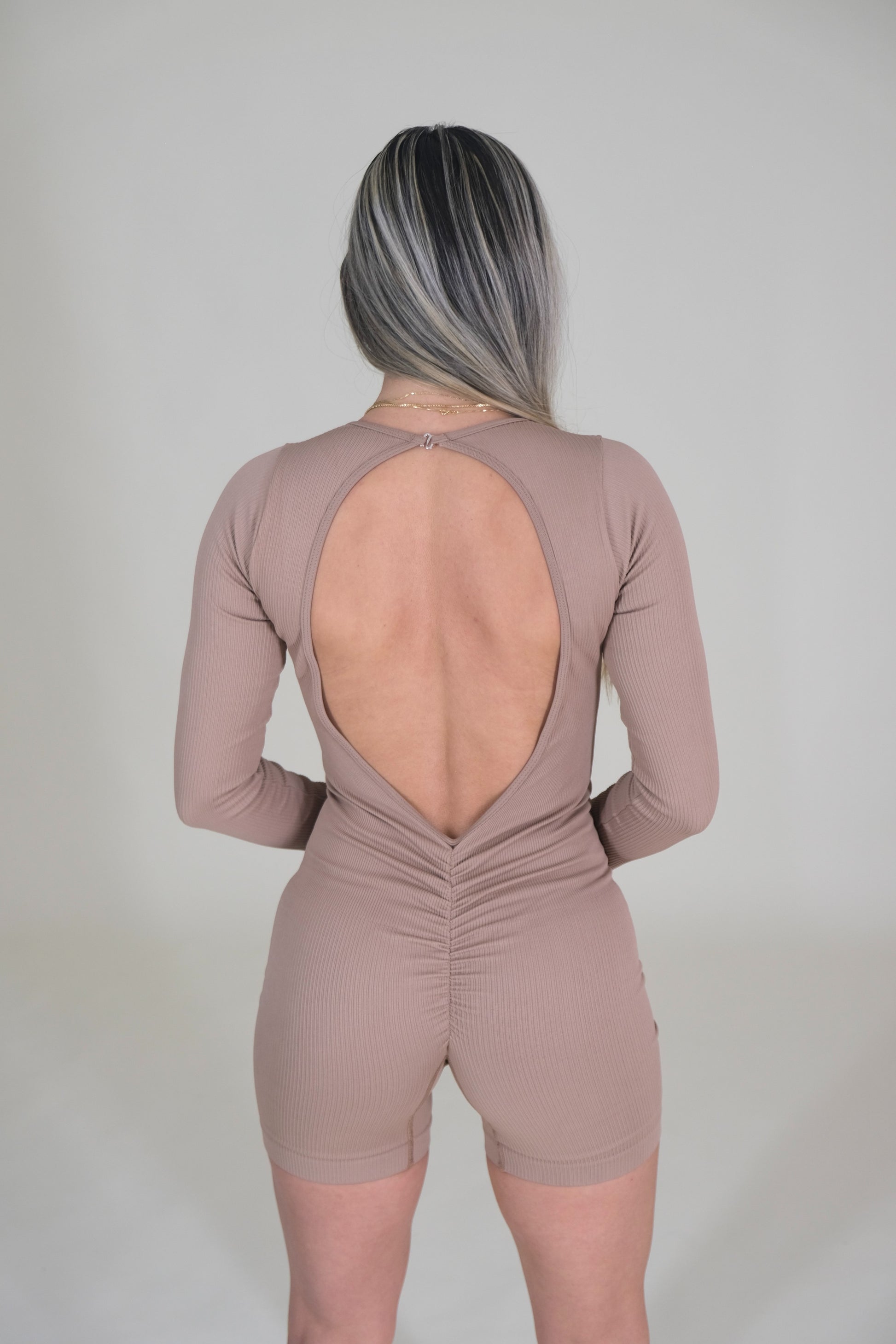 Refined and effortlessly sexy, the Dynamic Midnight Romper – Cocoa Dusk blends sleek long sleeves with a daring open-back cut. Made from ultra-soft ribbed fabric, it hugs your curves while keeping things breathable and bold. The warm cocoa tone adds a grounded elegance, perfect for cooler nights, confident movement, and everyday power.